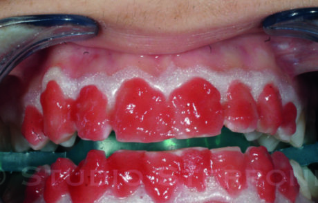 Il paziente si presenta presso il nostro studio dove vengono prese le impronte delle due arcate, inferiore e superiore. Successivamente vengono colate in gesso, ovvero viene costruita la bocca di gesso. Con una stampatrice a caldo viene creata la mascherina di poliuretano, rifinita con i serbatoi sulla parte anteriore per il gel sbiancante. Il paziente deve soltanto mettere una goccia di materiale in ogni piccolo serbatoio ogni sera.